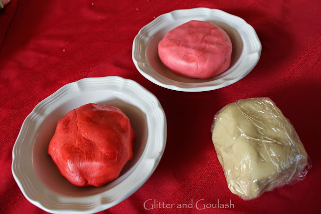 This is how the dough will look once the coloring has been added. I have chosen red, pink and white for my cookies.