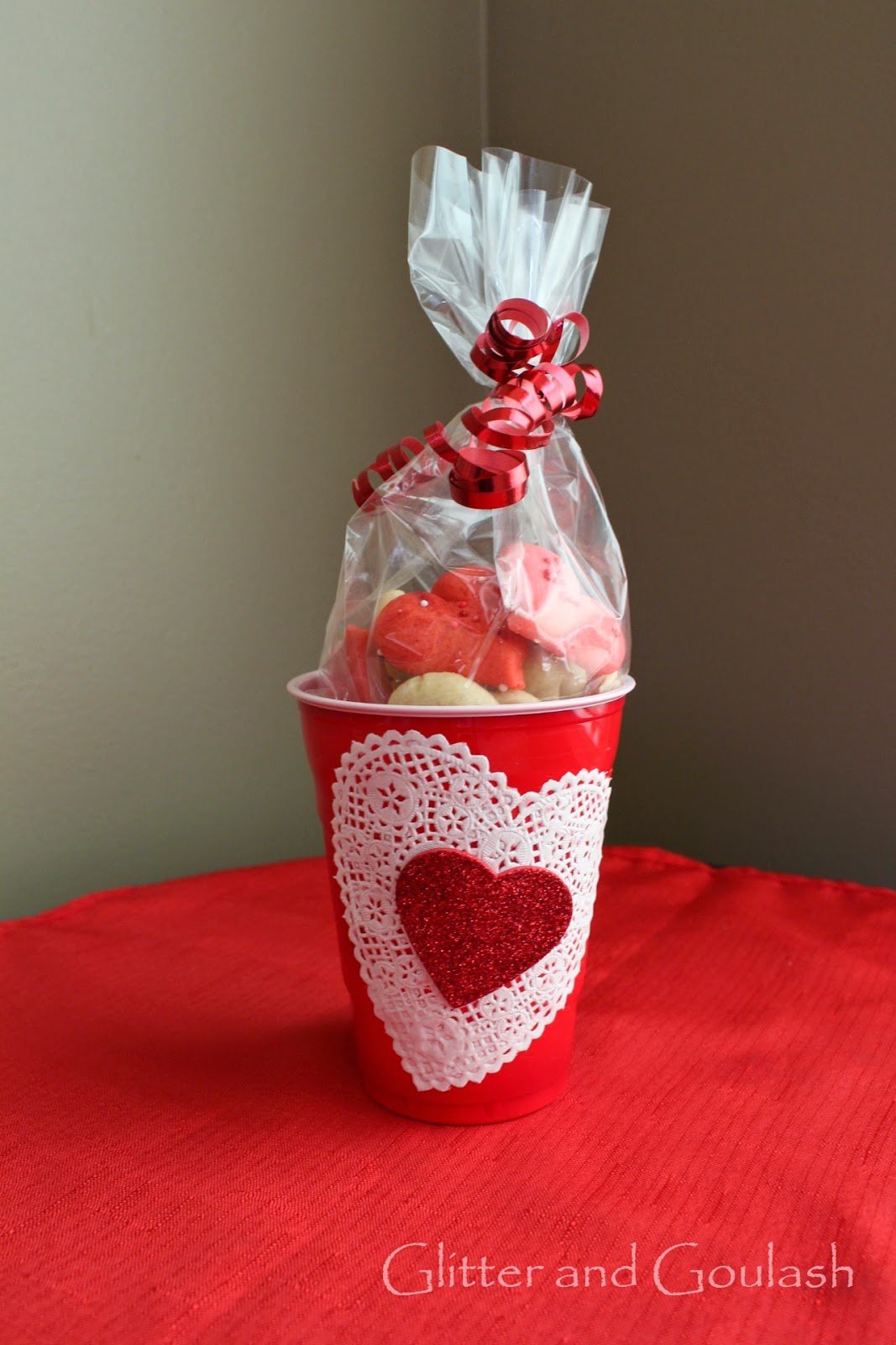 I like to wrap these little cookies up and use them for gifts.  There are so many adorable ways to package these yummy treats.  I usually just use whatever I have on hand.  Today, I had a red solo cup that I added a little doily and sticker to.